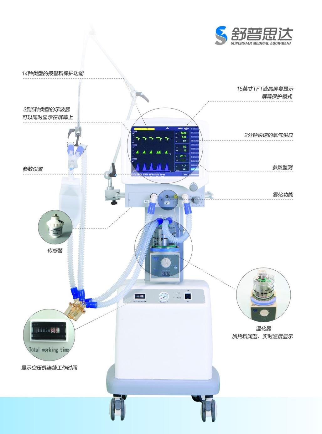 我司呼吸機適用于各類醫療機構用于心肺復蘇,重度呼吸衰竭,氧合功能障礙,術前,術后的呼吸支持以及其他呼吸治療。